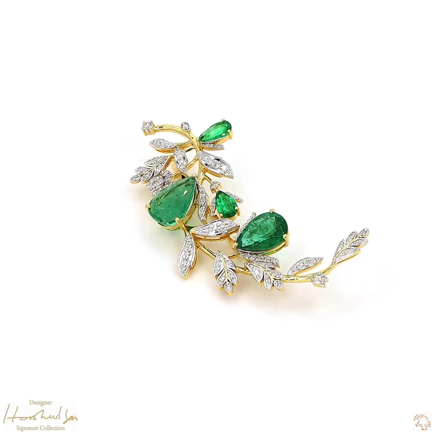 These four rare emeralds come from the famous mines of Colombia, known for having the most beautiful green fire in the world. The visionary Harshad Soni selected these pear-shape stones for their incredible clarity and arranged them to catch the light from every angle. It is a piece that feels both simple and very precious, focusing entirely on the quality of the earth’s rarest treasures. This brooch is a reminder that nature only creates a few truly perfect things, and these emeralds are among them.