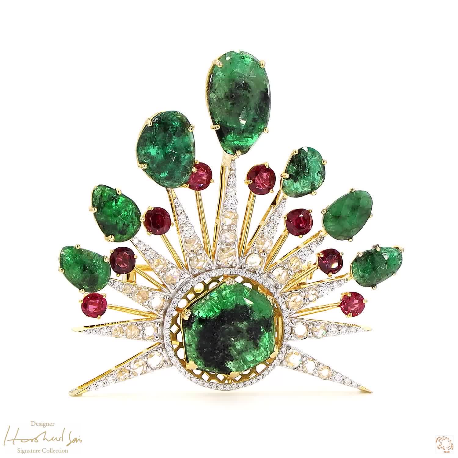 Availability: In StockThis brooch is a powerful mix of three of the earth’s most precious treasures: emeralds, rubies, and vintage diamonds. The visionary Harshad Soni used rose-cut diamonds to provide a soft, old-world glow that balances the deep green and vibrant red of the other stones. It is a piece of rare heritage that looks like a royal crest from a forgotten kingdom. Every stone is placed to tell a story of strength, history, and the timeless fire of the earth. Wearing it feels like carrying a secret piece of history on your shoulder.