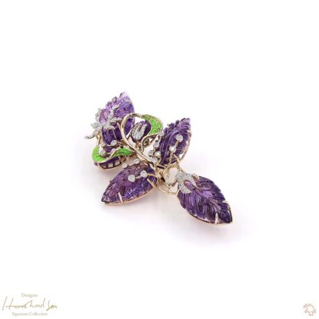 This brooch looks like a bunch of golden grapes hanging from a vine. The visionary Harshad Soni used eight flexible golden pearls that move slightly when you move, making the piece feel alive. It is a joyful celebration of a successful harvest and the abundance of nature. Wearing this piece brings a warm, golden glow to your day and reminds us of the many gifts the earth provides.
