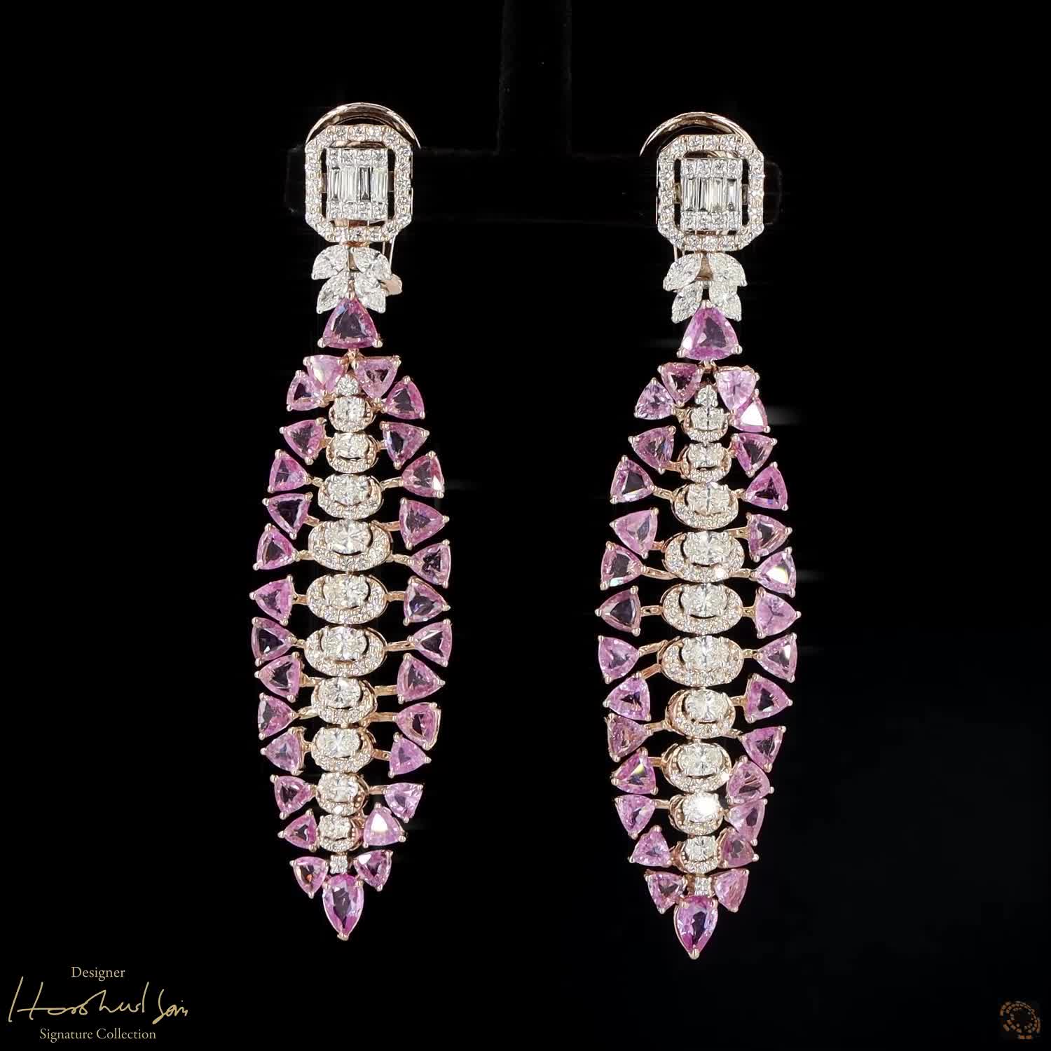 Availability: In StockThese long earrings move with the grace of a waterfall. The visionary Harshad Soni chose sixty rare triangle-shaped pink sapphires to create a look that is both sharp and feminine. Set in rose gold, the pink stones seem to glow from within, catching the light with every turn of your head. They are a celebration of modern shape and romantic color, coming together in a perfect flow.