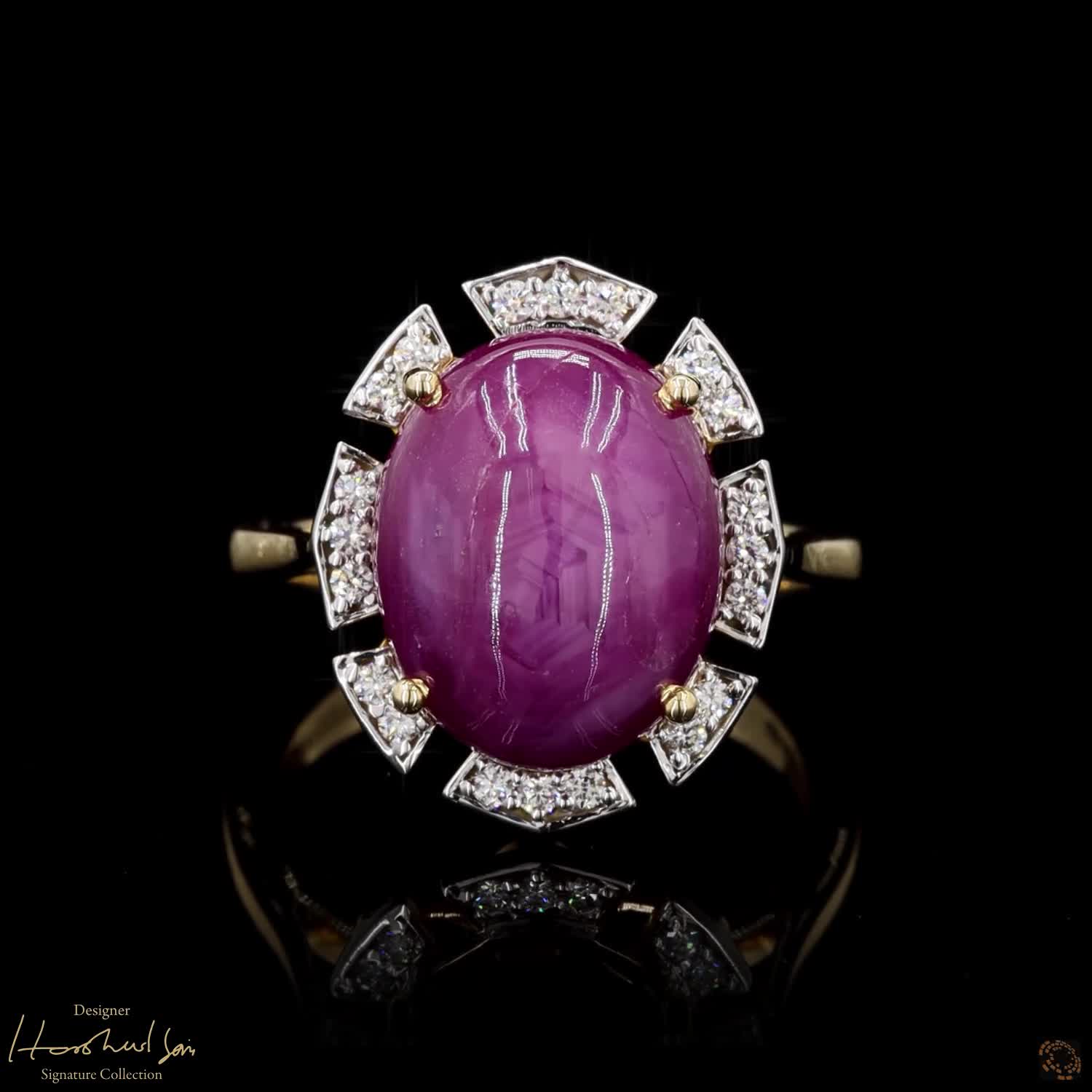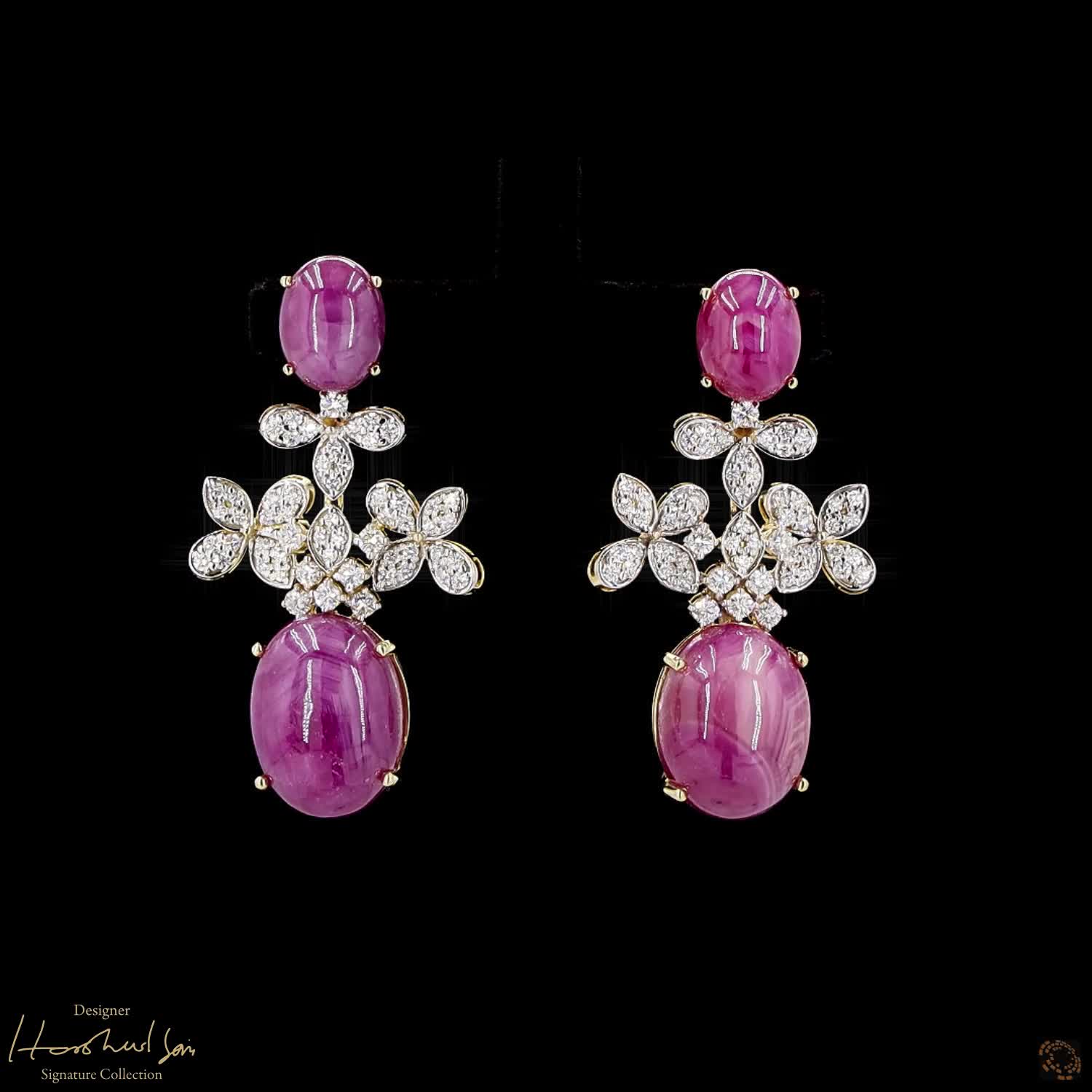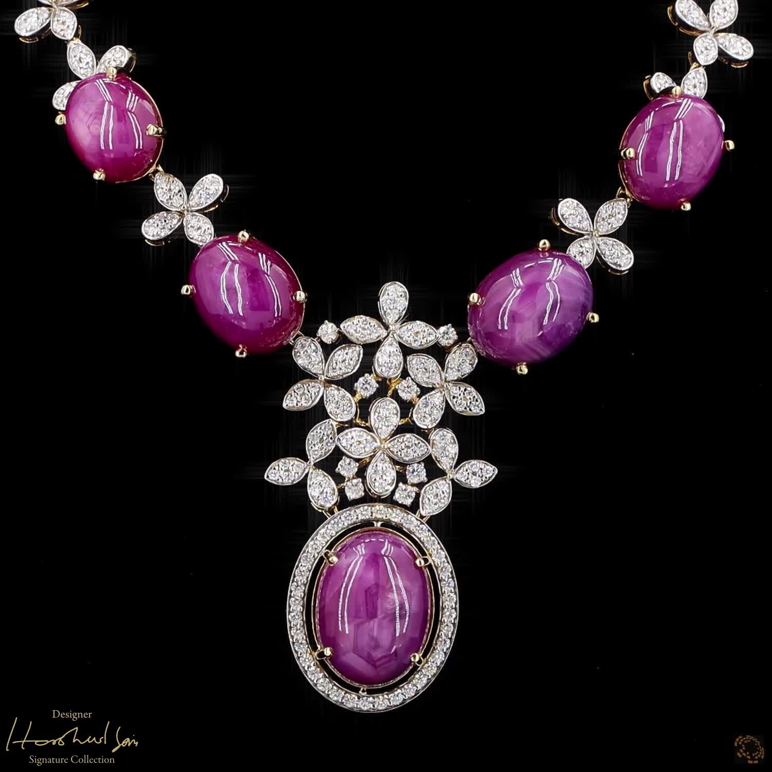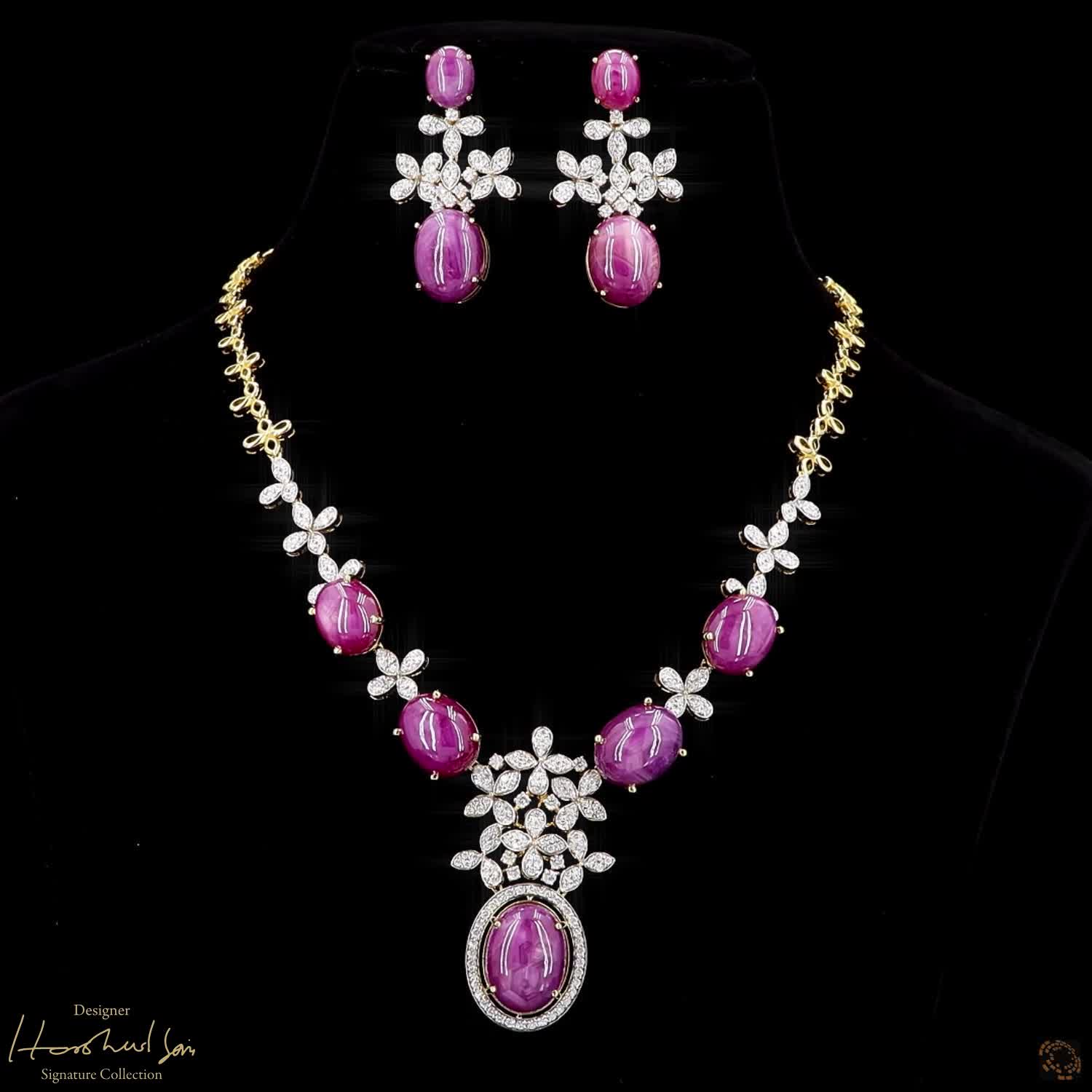 Star rubies are among the rarest gifts from the earth because they hold a glowing star inside their deep red heart. The visionary Harshad Soni gathered nine of these massive stones to create a necklace, earrings, and ring that look like they are made of frozen fire. Surrounded by natural diamonds, the red stars seem to float against a background of white light. This set is a true masterpiece of rare heritage, representing power and the eternal flame of nature.