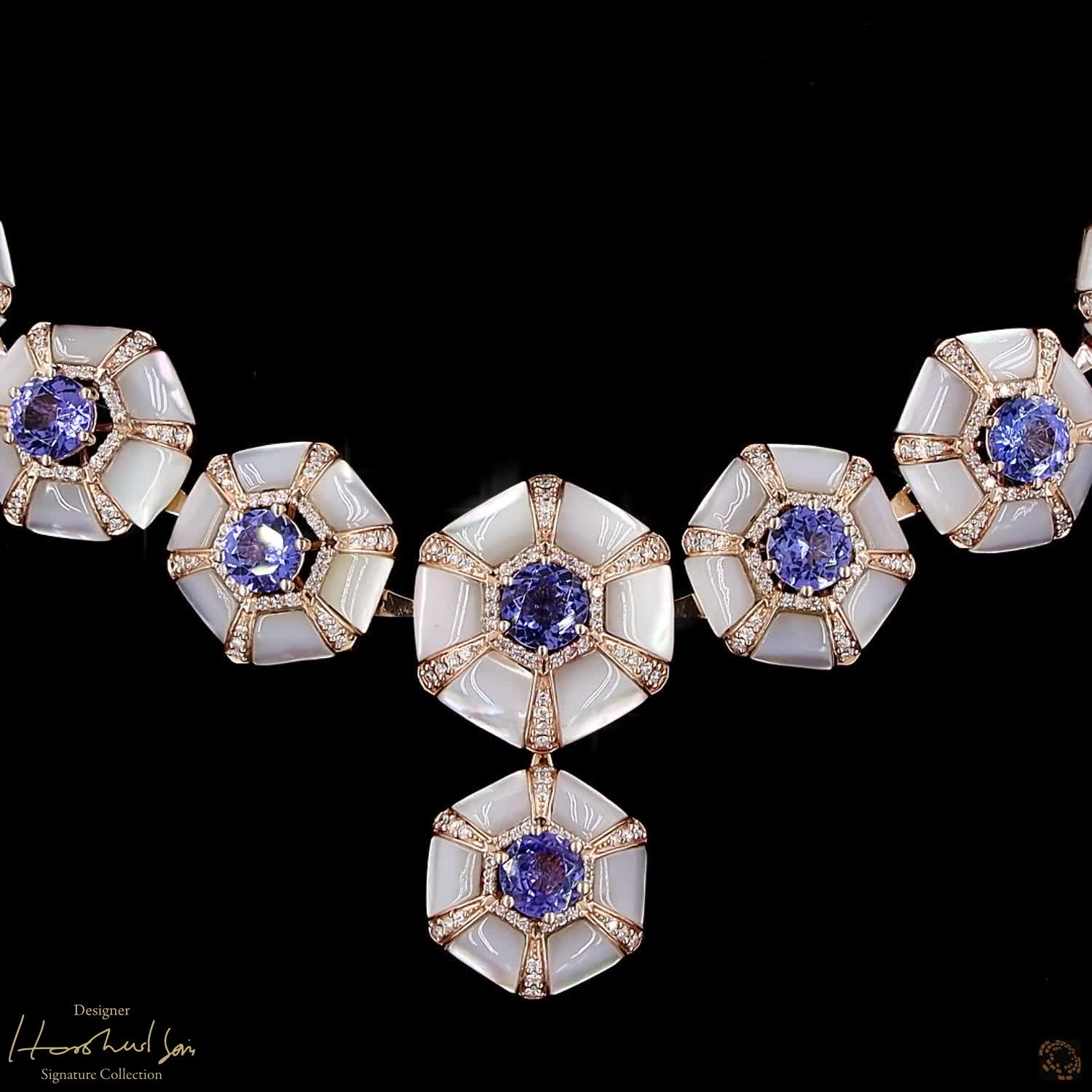 Availability: In StockImagine the color of the sky just as the stars begin to come out. The visionary Harshad Soni used violet-blue tanzanites and over a hundred pieces of Mother of Pearl to capture that magical moment. The rose gold frame makes the blue stones pop, creating a suite that feels like a piece of the evening sky you can wear. It is a soft, dreamlike set that brings a sense of wonder to whoever wears it.