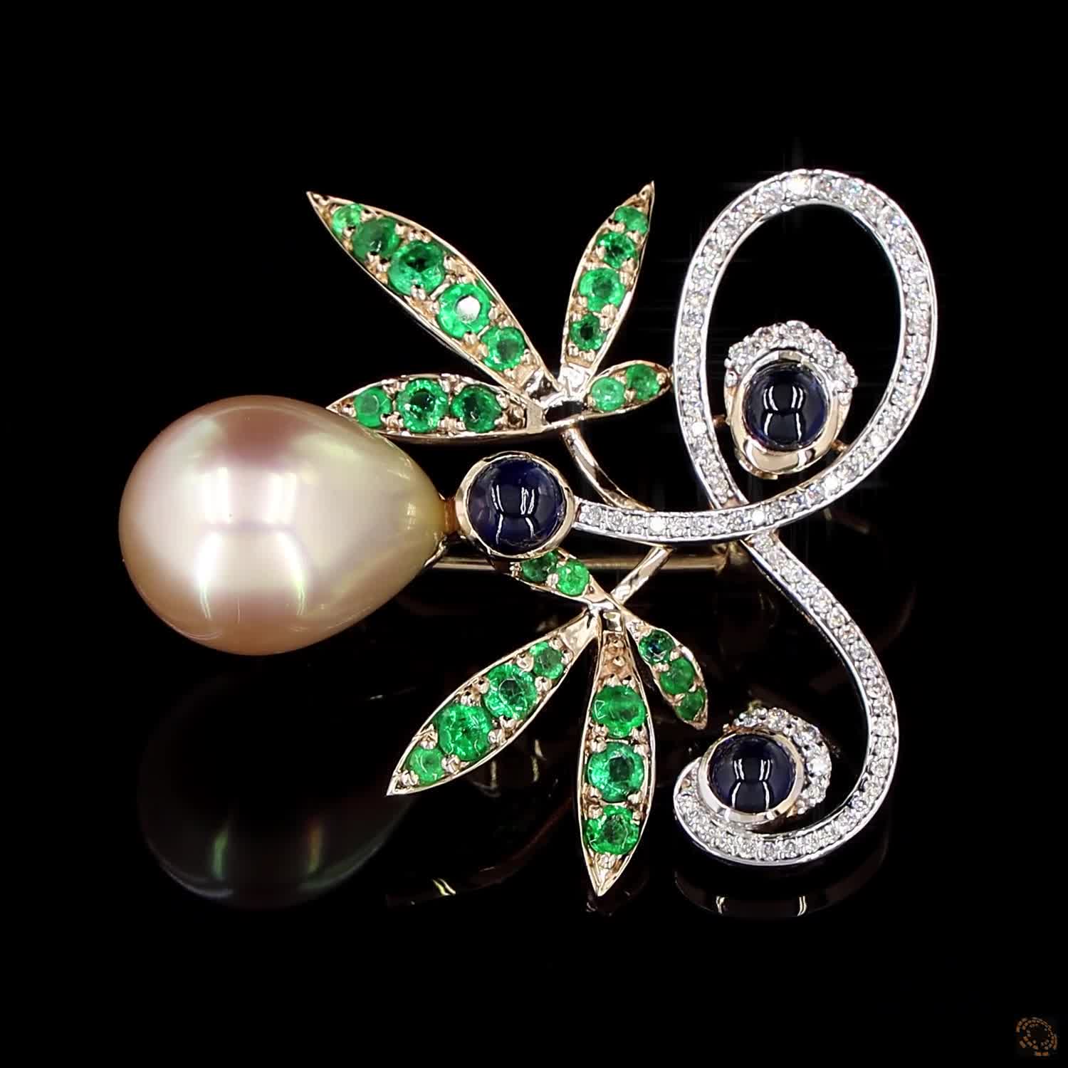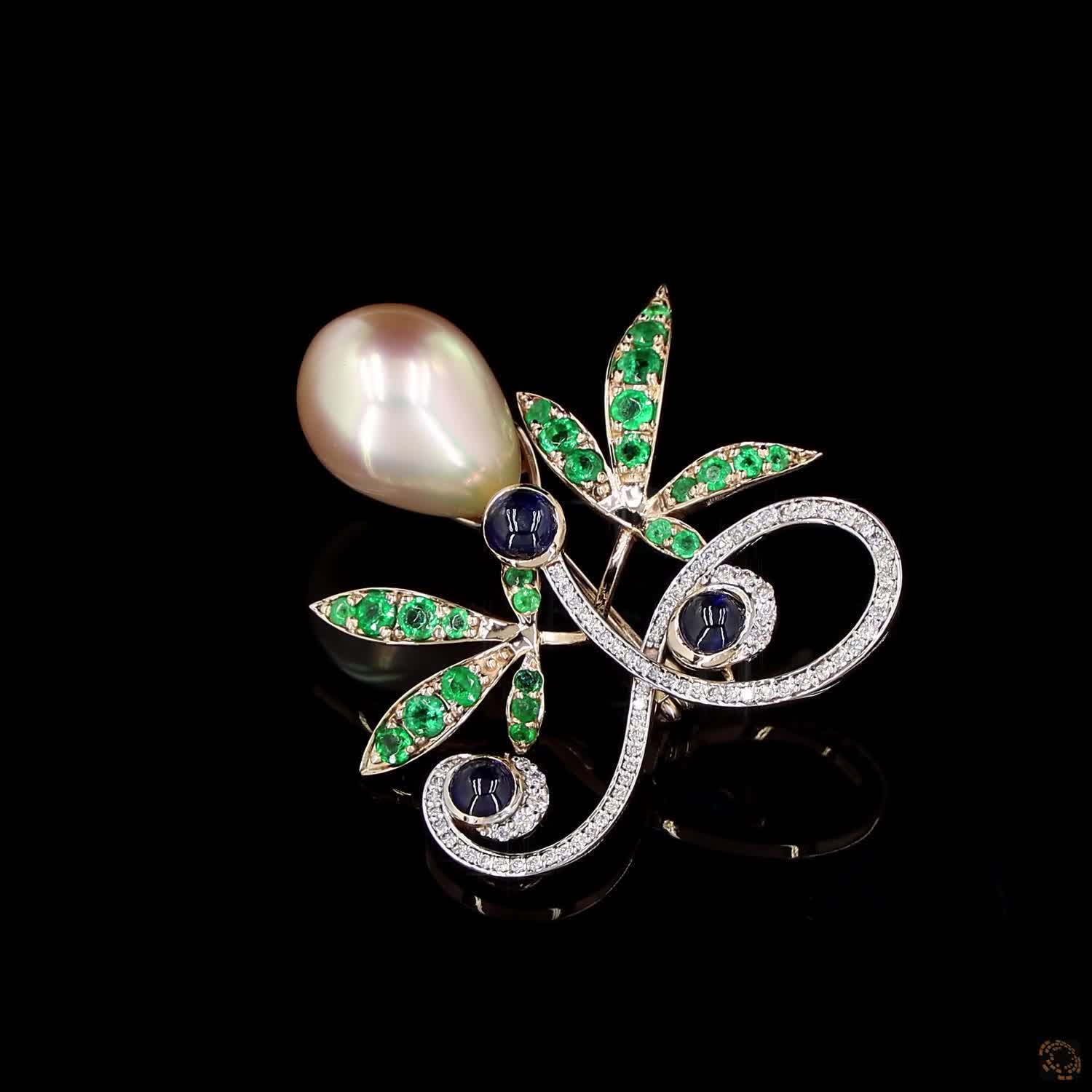 Availability: In StockThis brooch looks like a collection of treasures found on a secret island. The visionary Harshad Soni placed a large golden pearl at the center of a world of blue sapphires, emeralds, and diamonds. It is a colorful and rich design that brings together the best gems from the land and the sea. Wearing it feels like you are carrying a small, precious secret that only you know the story of.