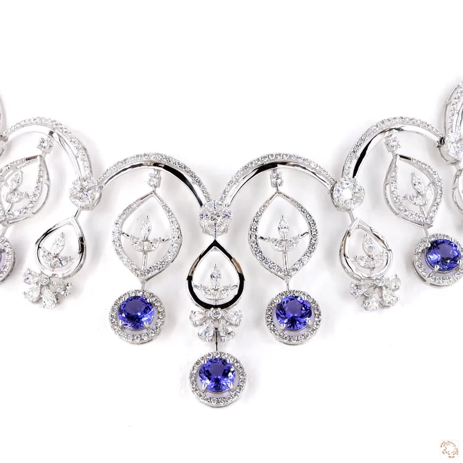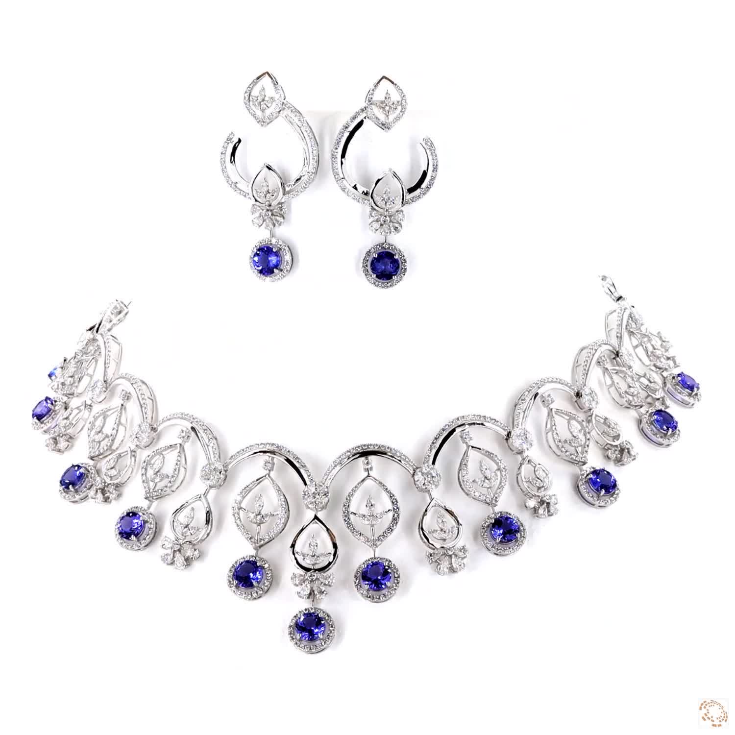 This suite is designed for someone who loves the crisp, clean look of ice and water. The visionary Harshad Soni used thirteen violet-blue tanzanites and set them in bright white gold to create a look that is cool and sophisticated. The diamonds act like frost catching the light, making the blue stones look even deeper. It is a modern and elegant set that brings a touch of winter magic to any occasion.